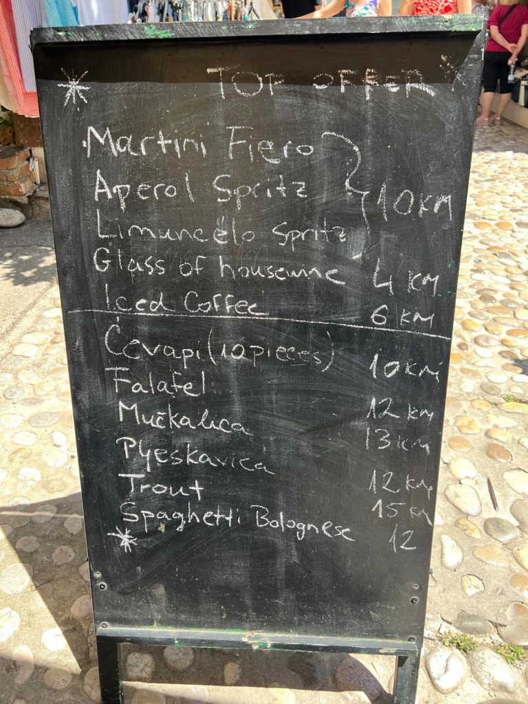 Walutą Bośni i Hercegowiny jest Marka Zamienna (BAM), która jest powiązana z Euro (EUR) w stałym kursie 1 EUR = 1.95583 BAM. Jak widzicie porządna porcja uwielbianego przez nas Aperol Spritz, kosztuje tu zaledwie 21 złotych, mniej więcej, a szklanka lokalnego wina, to koszt zaledwie 8,5 złotego!!! SZOK! To bardzo porządna cena, jak na dobrego drinka w gorący letni dzień (Właściwie chyba bardziej – późno wiosenny dzień), czy szklaneczkę lokalnie wyrabianego „soku z winogron”:). Całkiem zacnego soku, trzeba przyznać.