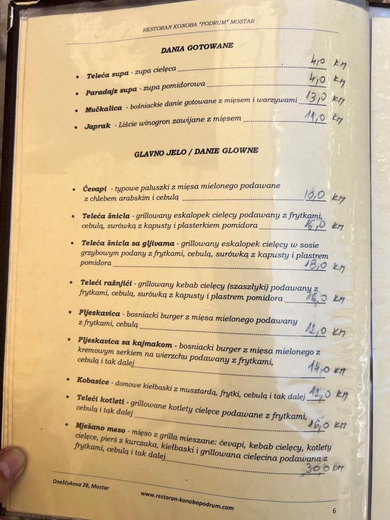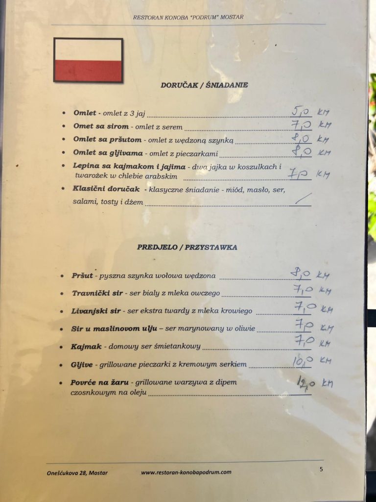 Widać, że spora ilość rodaków odwiedza Mostar. Menu po polsku? Nie ma problemu… bo praktycznie co druga restauracja, czy bar oferują polską wersję językową serwowanych przez siebie przysmaków. Poniżej Restauracja Podrum, w której usiedliśmy tylko na chwilę, aby schłodzić organizm pomarańczowym trunkiem, ze sporą ilością lodu:)
