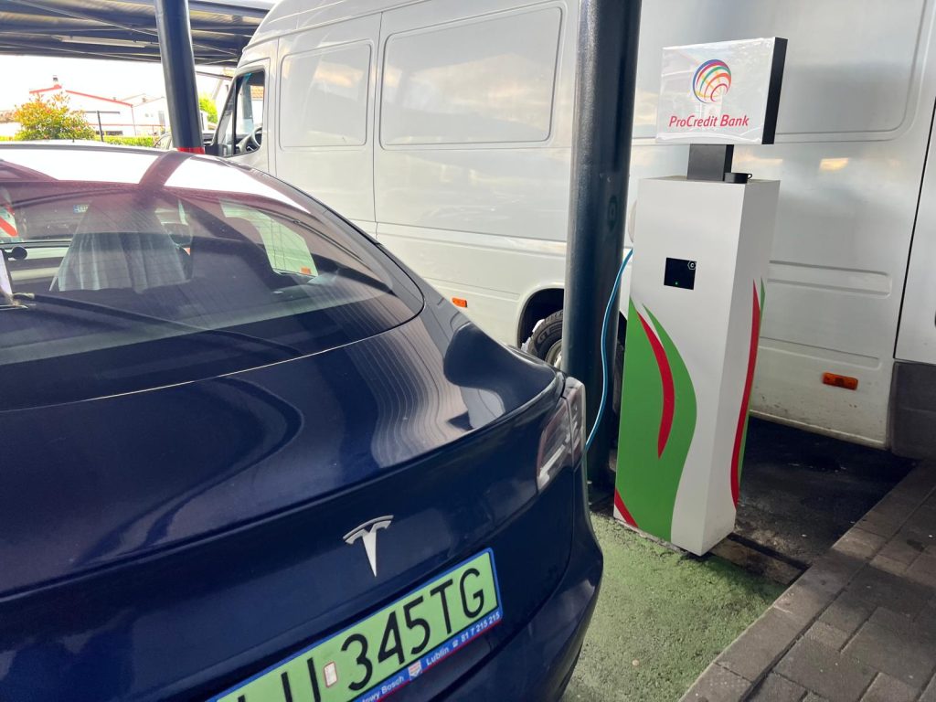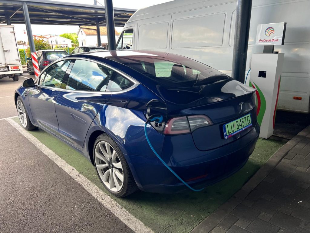 Małe zakupy w lokalnym markecie pozwoliły nam odkryć darmową stację ładowania. Niestety to wersja AC, więc musielibyśmy spędzić mnóstwo czasu aby się naładować. Na szczęście nasza Tesla Model 3, to wersja Long Range, więc tego typu trasy robi „na raz”, bez potrzeby ładowania. Tu podpięliśmy auto, tylko na zasadzie próby i pokazania, że można tu znaleźć darmowe stacje ładowania.
