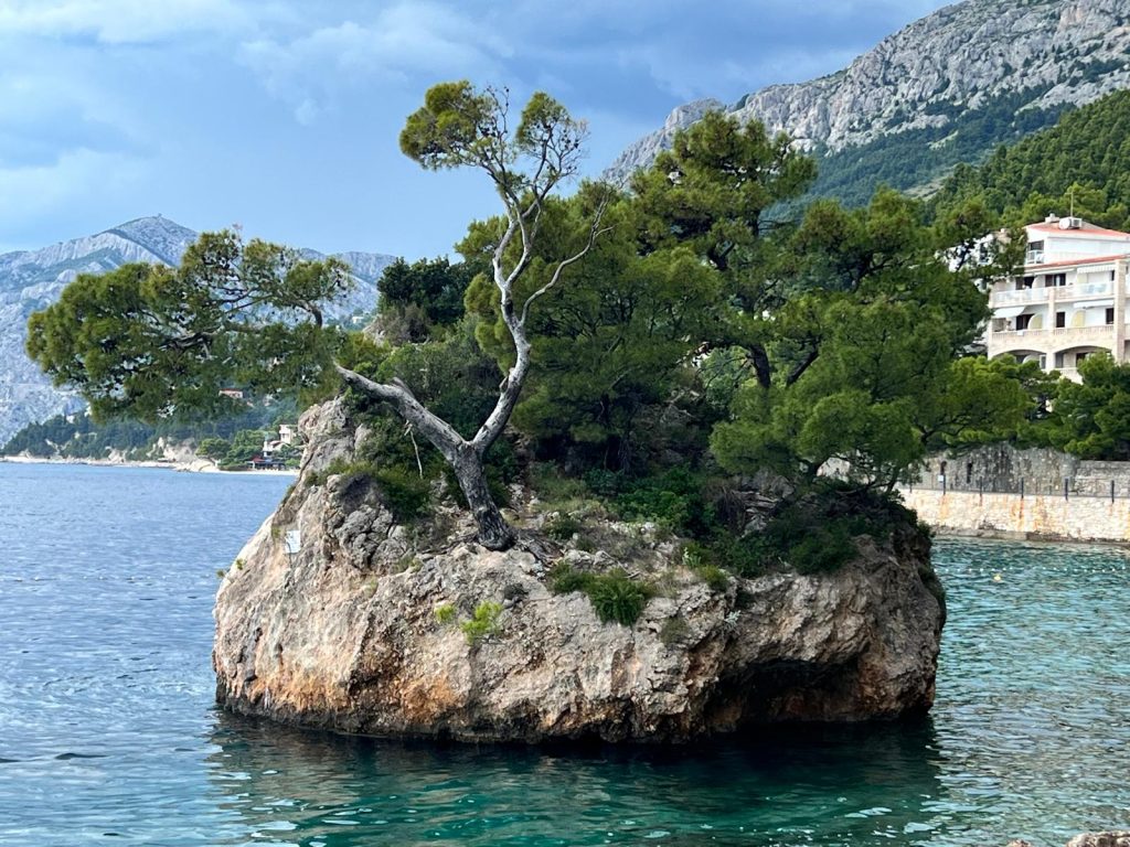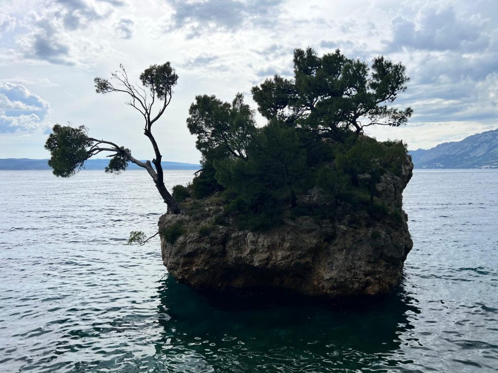 Kiedy wracaliśmy do naszego hotelu, postanowiliśmy odwiedzić dość popularną i znaną miejscowość, czyli Brelę. To nadmorskie miasteczko, bardzo urokliwe, z bardzo widokowym i przyjemnym nadmorskim deptakiem. Znakiem rozpoznawczym Breli, przedstawionym w herbie miasta, jest Kamień – najmniejsza wyspa Adriatyku – głaz brekcyjny, z charakterystycznym rodzajem roślinności jedynym w swoim rodzaju drzewem, które widzicie na zdjęciach. Jedyny taki obraz na wybrzeżu Chorwacji. Zobaczcie zresztą sami, jak prezentuje się symbol Breli.