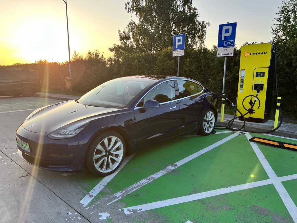 Poza tym, po szybkim przejechaniu prawie 190 km ze stacji UNIWAR, należała nam się chwila odpoczynku. Cóż, lata lecą, a naszego Leonarda również trzeba wyprowadzić na mały spacer. Chłopak waży zaledwie 3 kg, więc jego pęcherz nie wytrzymuje zbyt długo. Nasza BLU się ładowała, Leon spacerował, znacząc tutejsze krzaczki, jako swoje terytorium, a ja podziwiałem na parkingu Model S – dwukolorowy z napisem SpaceX. Widać tu jakiegoś fana twórczości Elona Muska (szeroko rozumianej😉)
