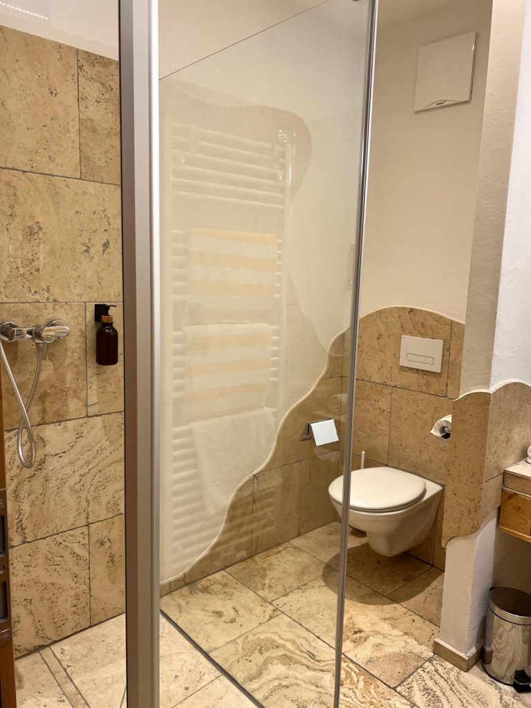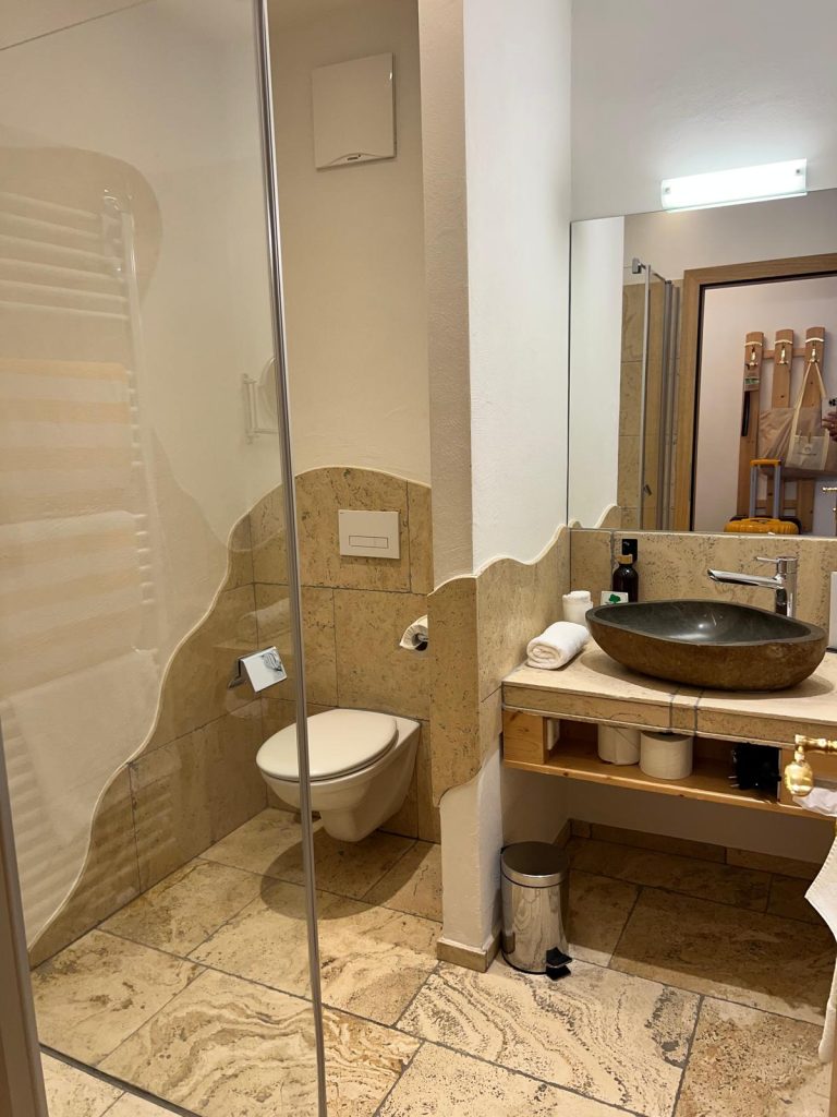 Toaleta, fikuśny zlew, jak wyciosany z kamienia, kabina prysznicowa… zapewniam, że niczego więcej nie będzie Wam potrzeba.