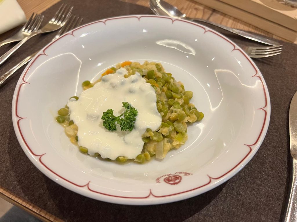 Piwo… zdecydowanie tak, po całym dniu jazdy, to jak nagroda. Zawsze to podkreślam. Przystawka w postaci czegoś w rodzaju sałatki z soczewicy z kleksem ze śmietany. Zadziwiająco lekkie, na pewno zdrowe, a dla mnie nieco niespotykane. Nie często jadam takie dania. Smak… na 5 i to z dużym plusem.