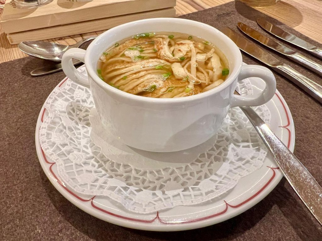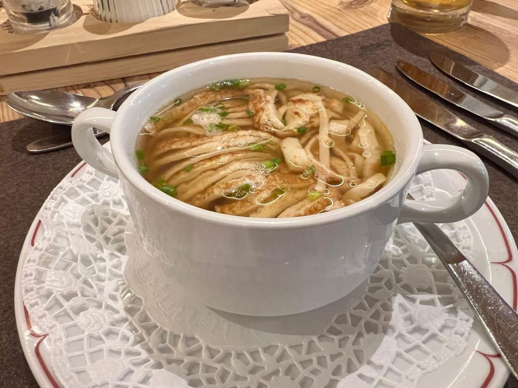 Tu szef kuchni poszalał, a my zdecydowaliśmy się na dwa różne dania. Ale najpierw jedliśmy coś naprawdę wybornego. Rosół wołowy z makronem ale bardzo nietypowym. Zrobionym bowiem z ciasta naleśnikowego. Jakby szef kuchni usmażył cienkie naleśniki, po czym za pomocą ostrego noża i swoich umiejętności krojenia, wyczarował coś w rodzaju włoskich tagliatelle. Głęboki smak i aromat, delikatny i niespotykany makaron. A to dopiero począteczek… rozbiegówka!