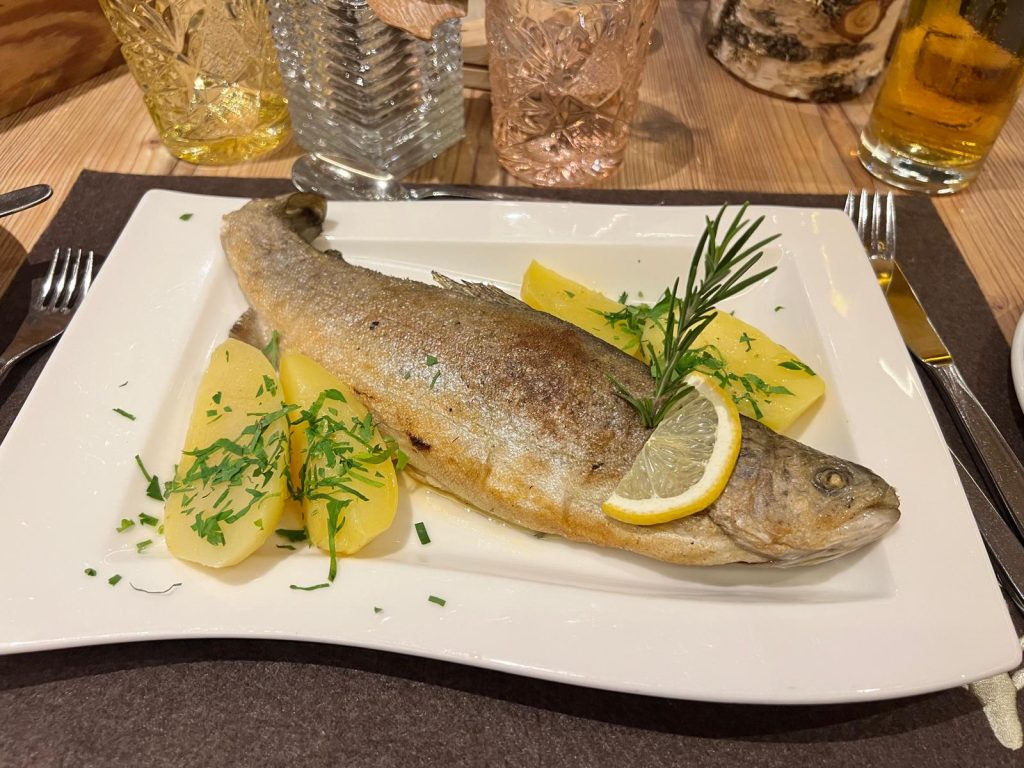 Moja żona wybrała coś bardziej górskiego i tradycyjnego. Rybka z ziemniakami, to zawsze dobre połączenie. A tutejsze pstrągi rozmiarami przypominają żarłacza białego😉, a nie typowego pstrąga. Jednak był on przyrządzony w sposób idealny. Mięso odchodziło od kości (ości) praktycznie samo. Było delikatne i aromatyczne. Tutaj wiedzą, jak przyrządzić dobrą rybę.