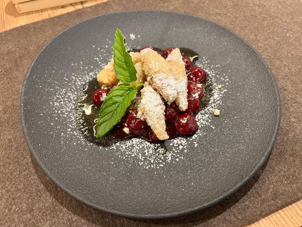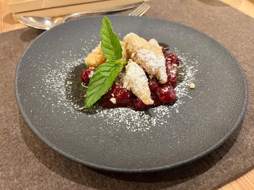 Deser mistrzów… to za mało powiedziane. Lokalne kluseczki, obtoczone w orzechach, nie wiem jakich. Może laskowych, pokruszonych – to na pewno! Do tego wyborny lekko zredukowany sos wiśniowy, czyli mój ulubiony. Wiśnie to zdecydowanie to, co doceniam najmocniej wśród owoców. Do tego listek mięty. Dla ozdoby i aromatu. To właśnie ten deser zaczarował mnie w sposób wyjątkowy. No i miła Pani, która nas obsługiwała, kiedy dowiedziała się, ze wiśnia to mój ulubiony owoc, zrobiła mi niespodziankę w postaci podwójnej porcji przepysznego i ciepłego wiśniowego sosu. Było warto, choć po deserze, byliśmy już najedzeni, jak kobieta ale zdecydowanie w dziewiątym miesiącu ciąży. To tylko takie porównanie… pozdrawiamy wszystkie panie w ciąży😉. Powinnyście zdecydowanie spróbować takiego deseru… każdy powinien.