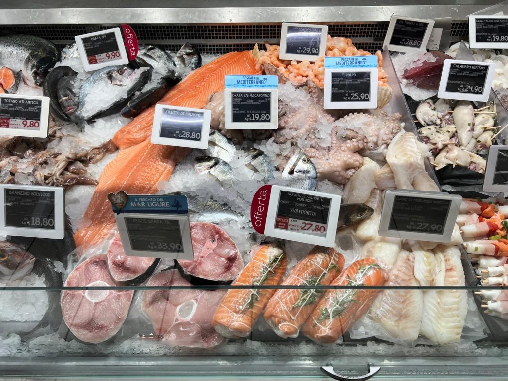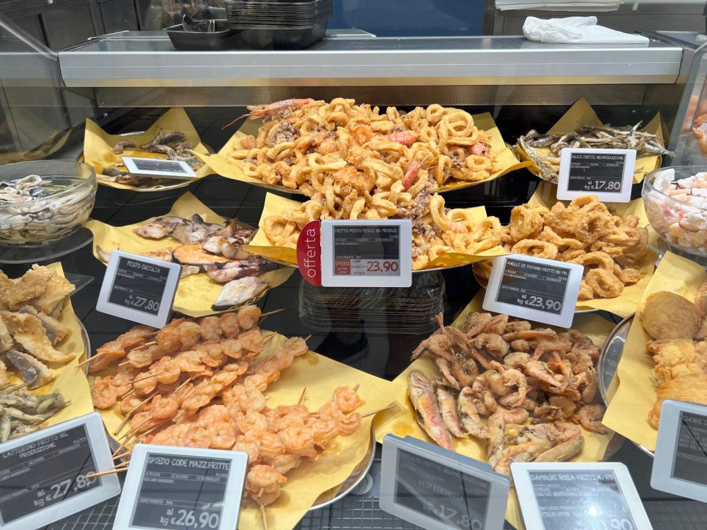 Jak to u Włochów. Owoce morza, gotowe Fritto Misto na wagę, szaszłyki z krewetek, mnogość ryb i morskich żyjątek. Oliwa, wina… wszystko co w Italii najlepsze i najsmaczniejsze. Ale czas goni, więc jedziemy dalej.